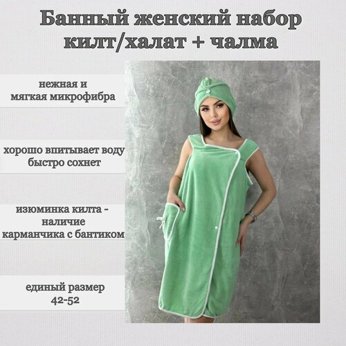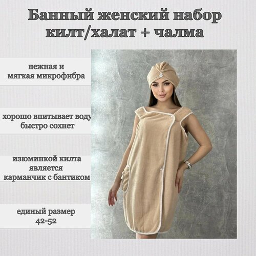 Банный набор женский из 2х предметов килт/халат с карманом и чалма из микрофибры