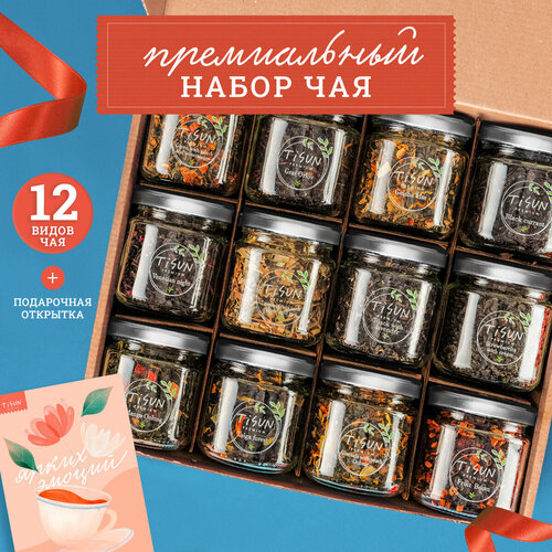 Чай листовой TiSun, подарочный набор ассорти из 12 баночек: зеленый, черный, молочный улун, фруктовый, с бергамотом / мужчине и женщине, маме, учителю