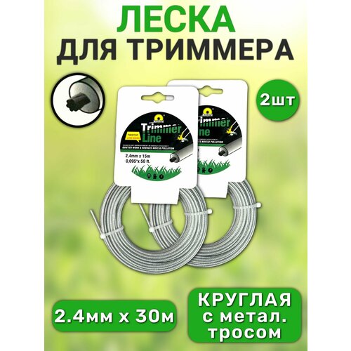 Набор лески для триммера, круглая с металлическим тросом, 2,4 мм х 15 м - 2 шт.