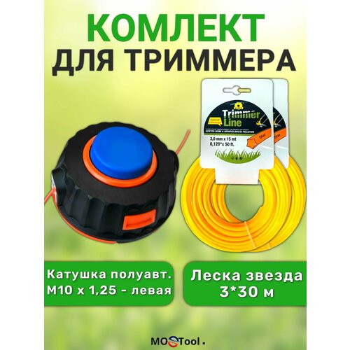Комплект: катушка для триммера полуавтоматическая М10х1,25 левая резьба + леска звезда 3 мм х 30м