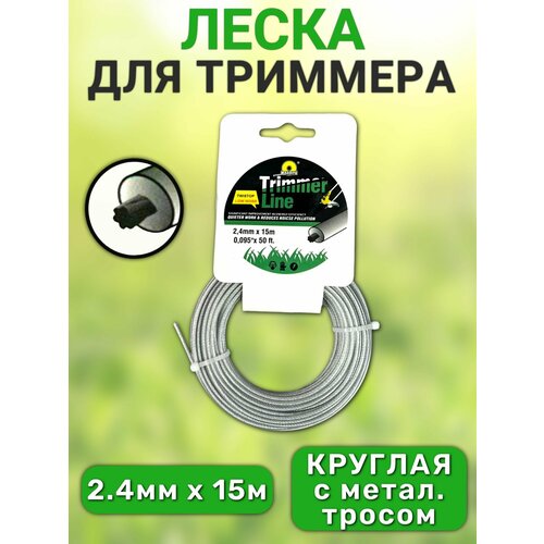 Леска для триммера, круглая с металлическим тросом, 2,4 мм х 15 м