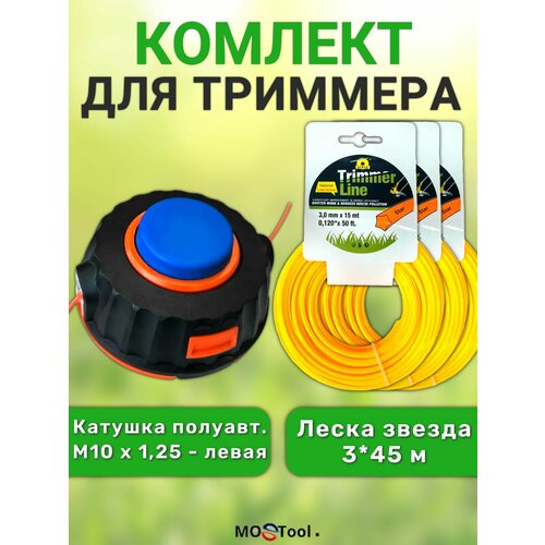 Комплект: катушка для триммера полуавтоматическая М10х1,25 левая резьба + леска звезда 3 мм х 45м