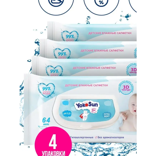 YokoSun Megabox Детские влажные салфетки, 256 шт (4 уп * 64 шт)