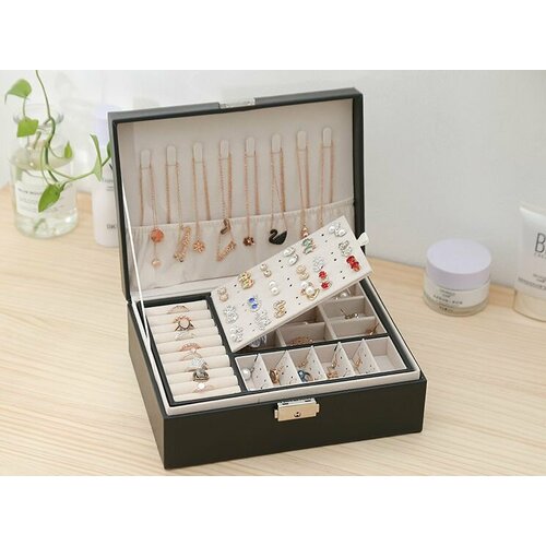 Шкатулка для украшений, бокс для хранения бижутерии, эко-кожа, черная, 14 отделений, 2 яруса, на замке