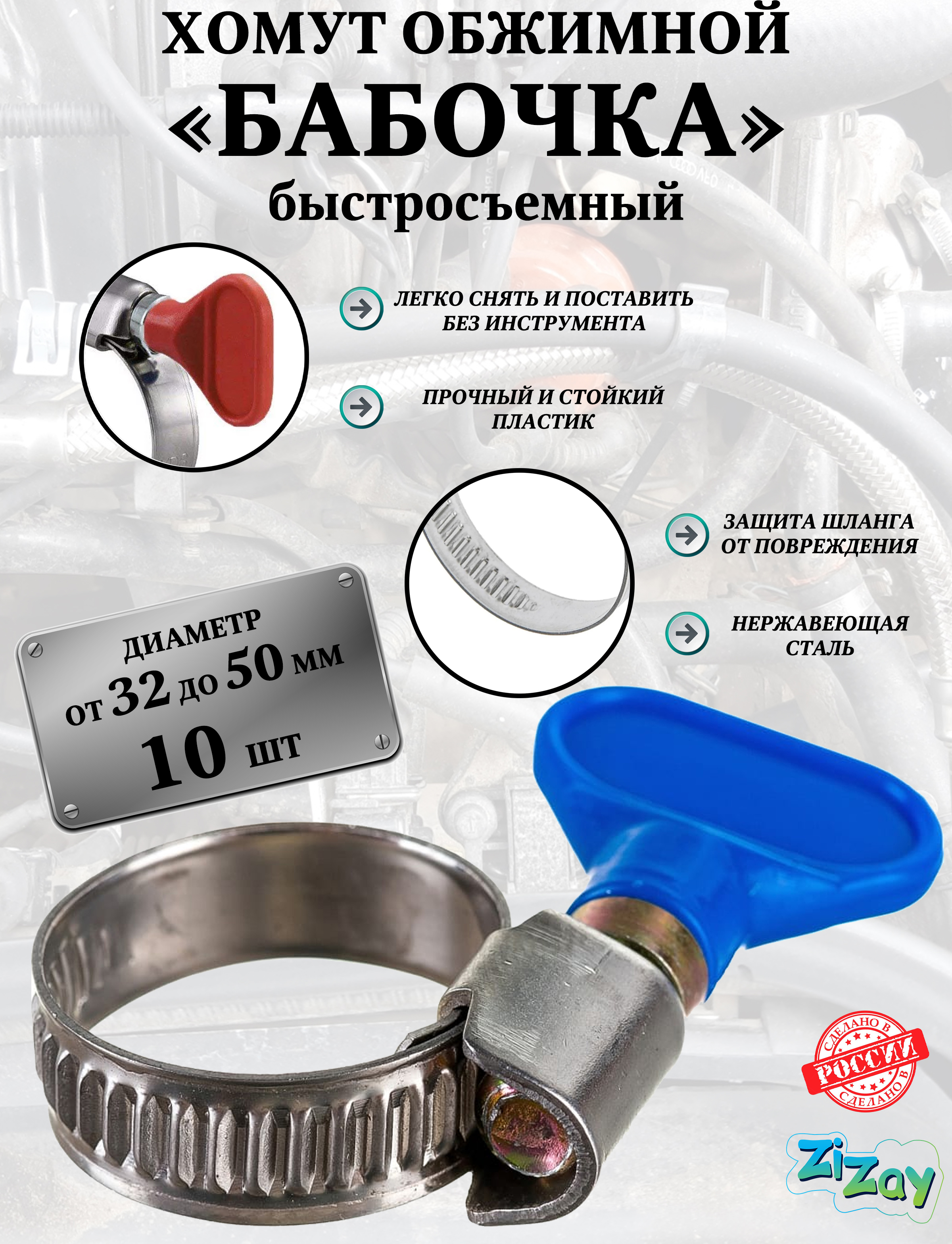 Хомут обжимной ZiZay "Бабочка", быстросъемный, нерж. сталь, 32-50 мм., упаковка 10 шт. к10-05-056