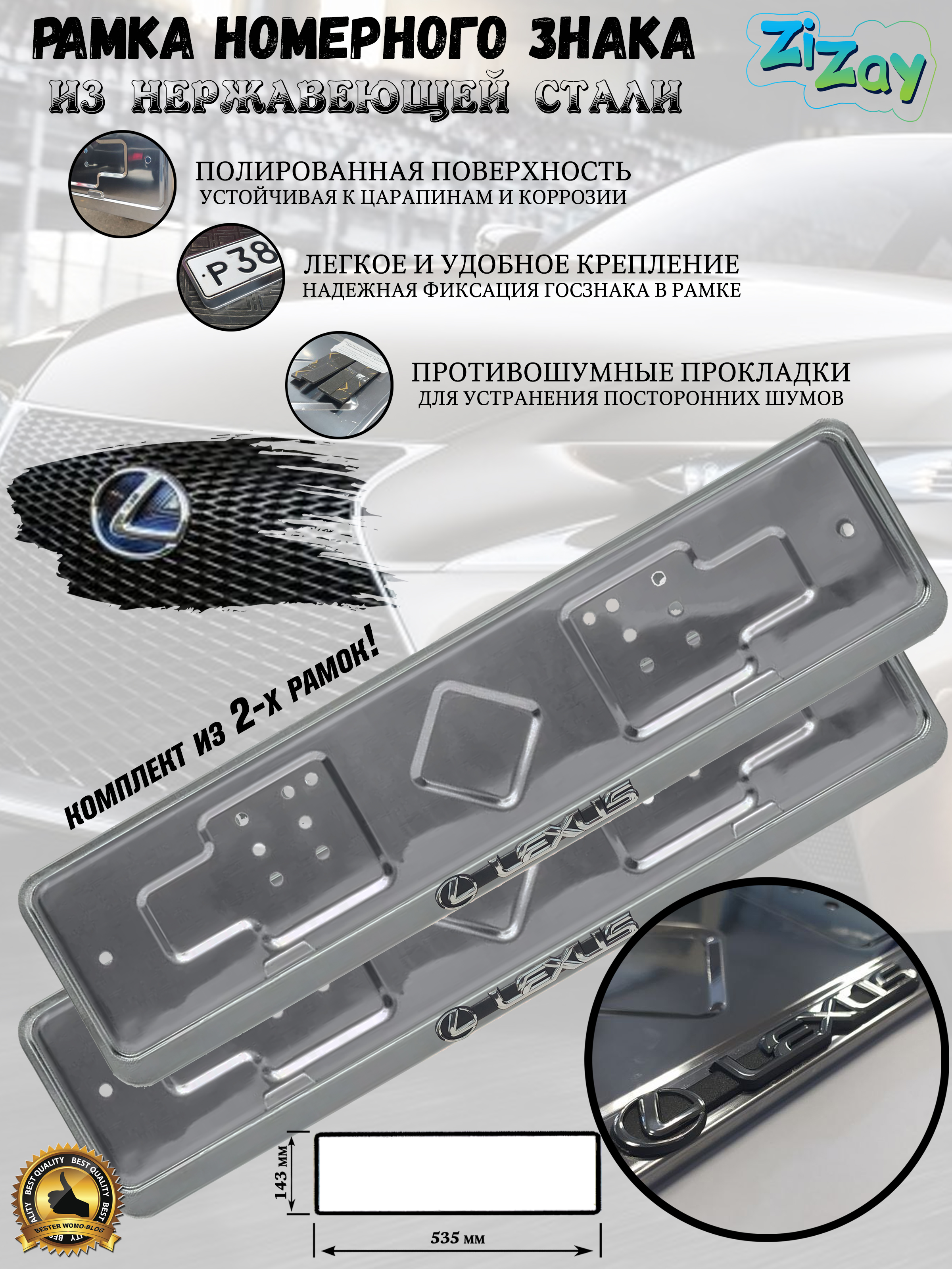 Рамка номерного знака ZiZay "LEXUS", стальная, серебристая, рельефная надпись, компл. 2шт к-AB-029-LS