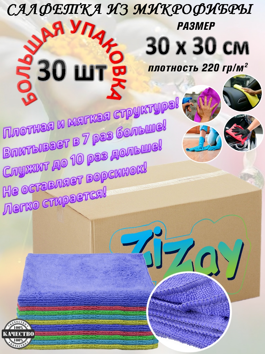 Микрофибра ZiZay, мягкое волокно, 30х30 см, лазерный шов, оверлок, упаковка 30 шт. Салфетки из микрофибры ZiZay