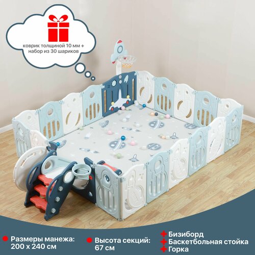 Манеж UNIX Kids "SUPREME Space" Blue, голубой/синий, 200x240 см, с ковриком, горкой и баскетбольным кольцом для дома и улицы