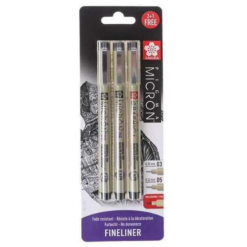 SAKURA Набор ручек капиллярных 3 штуки (линеры 0.35, 0.45; graphic 1.0) Sakura Pigma Micron, цвет чёрный (пигментные светостойкие чернила)