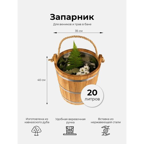 Запарник из дуба с пластиковой вставкой для бани 20 литров и крышкой в комплекте, ведро для запарнивания веников и горячей воды
