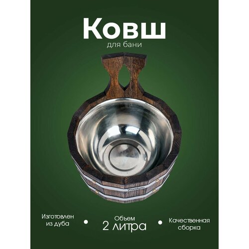 Ковш деревянный для поддачи воды в баню и сауну Woodson из кавказского дуба в темном цвете со вставкой из нержавеющей стали, объем ковшика 2 л