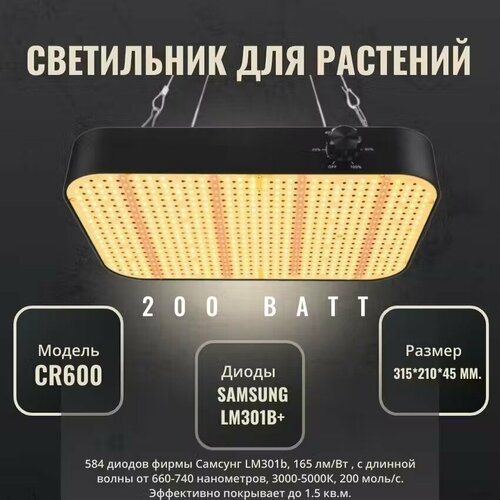 Светильник для растений/ квантум борд CR600-200 Вт/ с активным охлаждением/ Samsung LM301B+/ 600 светодиодов, 26 дБ, полный спектр ИК УФ