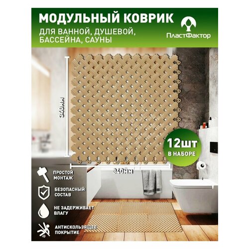 Коврик антискользящий для ванны, бассейна, сауны, бани - Aqua Stone, 12 модулей бежевый