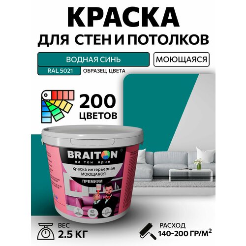 Краска ВД интерьерная BRAITON Премиум Моющаяся 2,5 кг. Цвет Водная синь RAL 5021