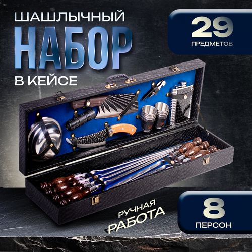 В комплект входят 6 шампуров из нержавеющей стали - для жарки шашлыка и люля кебаб на мангале. Рабочая длина лезвия 40 см. Общая длинна шампура в 63 см. Толщина стали: 3 мм. Кизлярский острый нож для разделки мяса, рыбы и овощей. Нож-вилка для снятия мяса с шампура. Столовые приборы на 4 персоны. Так-же 4 стопки по 50 мл. и Фляжка на 250 мл. Этот мужской набор расширен кованым, цельнометаллическим топором с рукоятью из дерева. Светодиодным фонариком и штопор – открывалкой. Все предметы имеют свое место в чемодане и плотно скреплены ремешками из натуральной кожиС помощью этого шашлычного набора вы сможете легко устроить гриль - вечеринку для друзей и коллег, кемпинг
