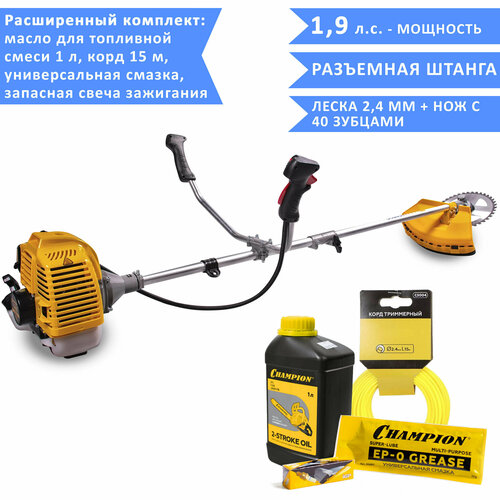 Садовый бензиновый триммер (бензокоса) CHAMPION T523, разъемная штанга, леска/дисковый нож, 1,9 л. с. + масло, свеча, смазка и леска