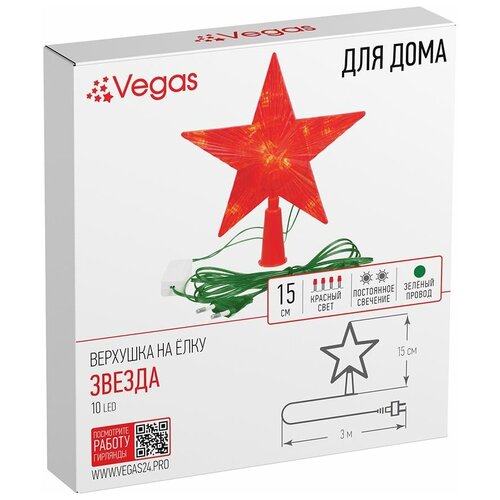 VEGAS Верхушка на елку "Звезда" красная 10 красных led, зелёный провод 3м, 15*15 см, 220 v /20