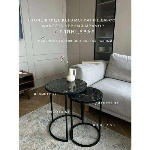 Комплект журнальных столов из керамогранита диаметр 48-39 см, высота 49-45 см, золото, столешница керамогранит глянцевая