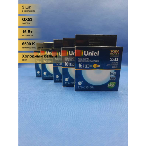 (5 шт.) Светодиодная лампочка Uniel GX53 св/д 16W(1400lm) 6500K 6K 75х30 матовая LED-GX53-16W/6500K/GX53/FR