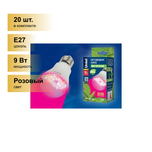 (20 шт.) Светодиодная лампочка Uniel фито лампа св/д для растений A60 E27 9W 9мкмоль/с, прозр. 108x60 IP20 LED-A60-9W/SP/E27/CL