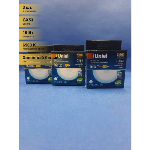 (3 шт.) Светодиодная лампочка Uniel GX53 св/д 16W(1400lm) 6500K 6K 75х30 матовая LED-GX53-16W/6500K/GX53/FR