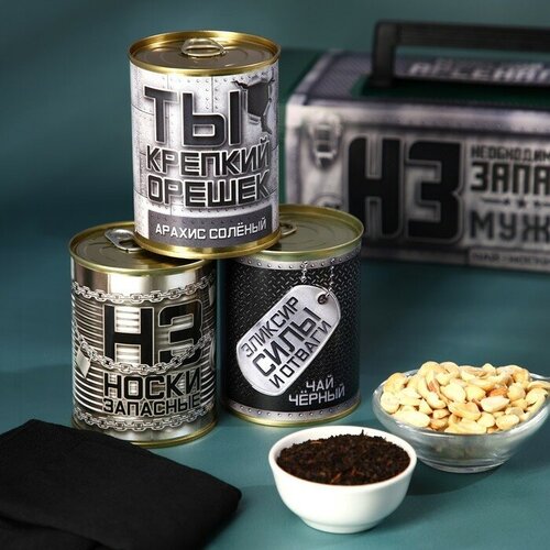 Набор «Необходимый запас» в ящике для инструментов, чай чёрный со вкусом имбиря 60 г, арахис жарный с солью 100 г, носки.