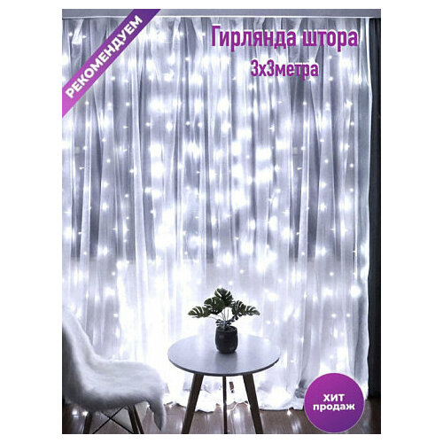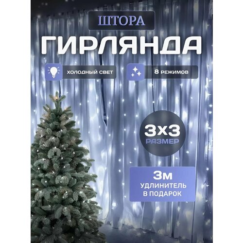 Новогодняя гирлянда-штора 3х3 с удлинителем в подарок, холодный свет