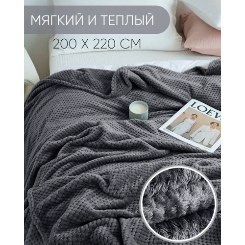 Плед плюшевый на кровать, диван / велюр / вафелька / евро 200х220 см / цвет темно-серый, антрацит/ в спальню, дом, для пикника, в машину