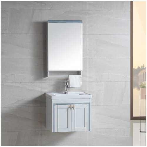 голубой, белыйSOFIA 405BU комплект мебели тумба с раковиной и зеркалo производитель RIVER Россия описание : Материал корпуса аннодированный алюминий Материал фасада алюминий, PVC пластик Материал раковины фаянс Оснащение механизм доводчика, полочки Конструкция одна дверь, универсальная Монтаж подвесная Цвет матовый белый с голубым Размер зеркала Шх