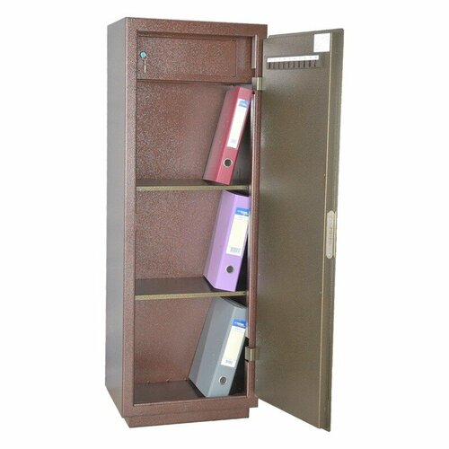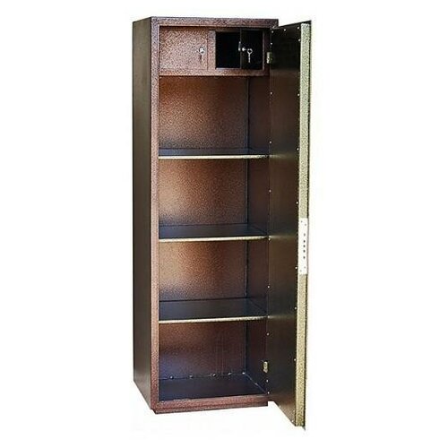 Сейф трехсекционный, оснащен тремя съемными полками. В двери установлен ключевой 8-ми сувальдный замок ЗАО «