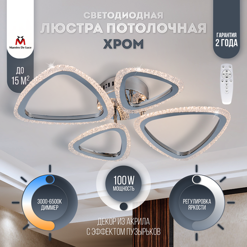 хромЛюстра потолочная светодиодная с пультом для гостиной или спальни, для кухни, в детскую комнату, светильник потолочный светодиодный Maestro De Luce. Цвет люстры хром. Диаметр 67,5 см, высота 7,5 см. Мощность 101 W. Световой поток 7575 Lm. Материал: металл, акрил. Светильник потолочный с пультом осветит помещение до 18 кв. м. На меньшую площадь убавляйте яркость. С помощью пульта или смартфона регулируйте режимы свечения. Включайте ночник в спальне или детской комнате, не вставая с кровати. Управляемая светодиодная люстра подойдет к любому стилю интерьера - классика, лофт, хай-тек и др. Люстра потолочная светодиодная подойдет на любой потолок, в том числе и натяжной. Лампа светодиодная обеспечивает высокий уровень цветопередачи, так что получается яркий и насыщенный свет без искажения оттенков. Настраивайте яркость, создавая наиболее комфортные условия для любой ситуации. Например, можно сделать яркий свет для работы или мягкое освещение для отдыха. Светодиоды выстроены по специальной схеме, за счет чего обесп