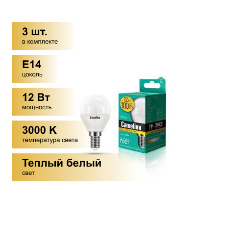 (3 шт.) Светодиодная лампочка Camelion Шар G45 E14 12W(960lm 220гр.) 3000K 2K матов. 90x47 пластик LED12-G45/830/E14
