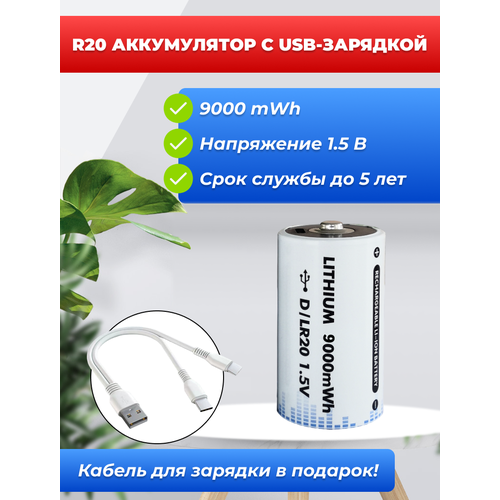 R20 Аккумулятор с USB-зарядкой, 9000mWh 1.5В