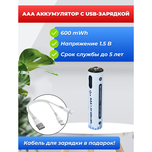 ААА Аккумулятор с USB-зарядкой, 600 mWh 1.5В