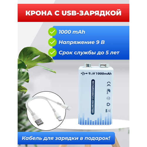 Крона Аккумулятор с USB-зарядкой, 1000mAh 9В
