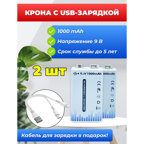 Крона Аккумулятор с USB-зарядкой, 1000mAh 9В, 2 шт