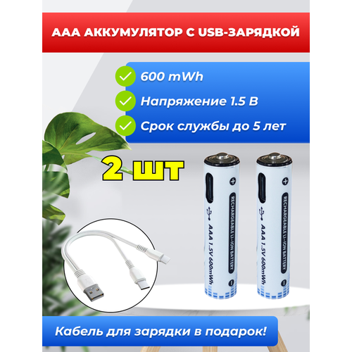 ААА Аккумулятор с USB-зарядкой, 600 mWh 1.5В, 2 шт