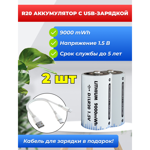 R20 Аккумулятор с USB-зарядкой, 9000mWh 1.5В, 2 шт