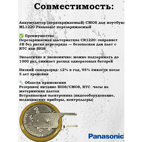 Аккумулятор (перезаряжаемая) (1шт) Panasonic ML1220 3V 18mAh для Samsung NP350, NP350V5C, NP355V5C, NP350E5C