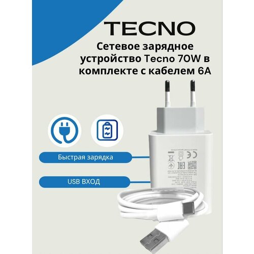Сетевое зарядное устройство для Tecno/ Infinix 70W ( U700XEA) в комплекте с кабелем 6А/Быстрая зарядка.