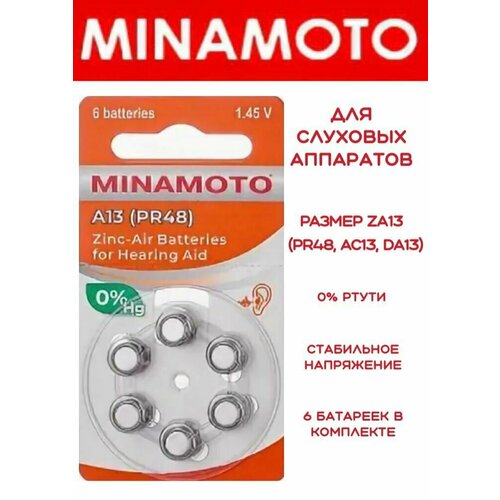 Батарейки Minamoto ZA13, PR48 для слуховых аппаратов, 6 шт.