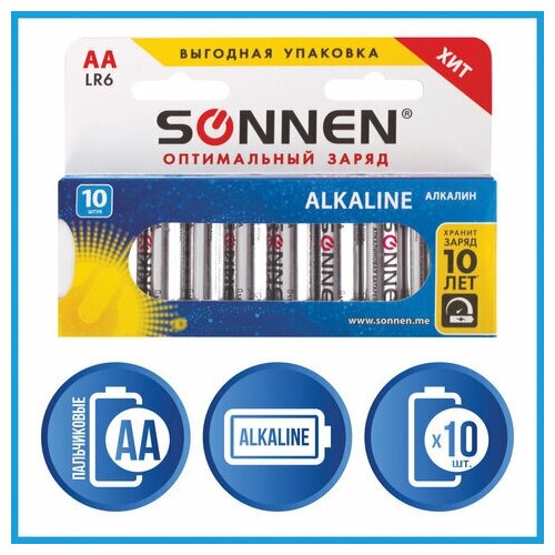 Батарейки комплект 10 SONNEN Super Alkaline АА (LR6 15А) алкалиновые пальчиковые в коробке, 3 шт