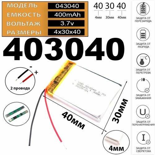 Аккумулятор 3.7v 400mAh 2pin 403040 Li-Pol универсальная аккумуляторная батарея 4x30x40 2 провода Терабайт Маркет