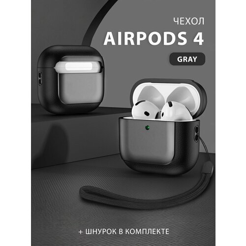 Чехол для наушников AirPods 4 (2024) дизайн под кожу и металл со шнурком, эко кожа, черный-графитовый