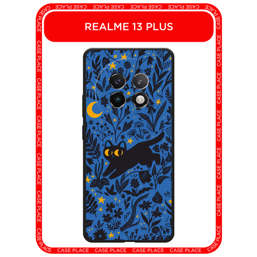 Черный матовый чехол на Realme 13+ / Реалми 13+ с принтом Ночной котик