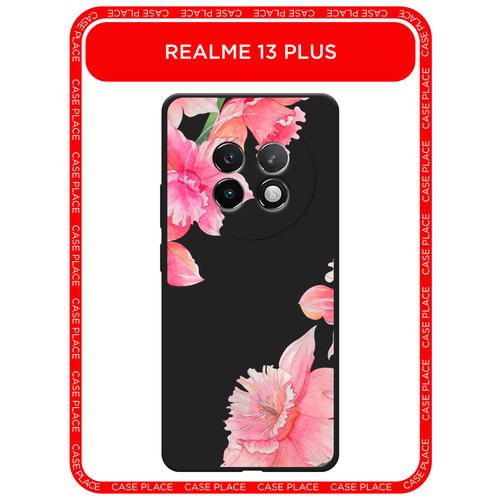 Черный матовый чехол на Realme 13+ / Реалми 13+ с принтом Розовые цветочные уголки