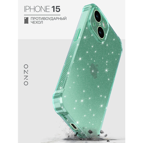 Противоударный чехол на iPhone 15 / Айфон 15 бампер прозрачный зеленый с блестками