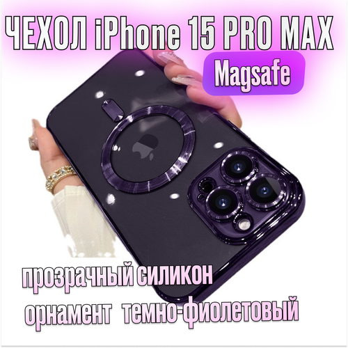 Магнитный силиконовый чехол на iPhone 15 PRO max магсейф (на айфон 15 про макс) с поддержкой Magsafe с магнитной зарядкой и защитой камеры, прозрачный, орнамент темно-фиолетовый.