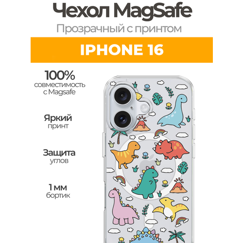 Чехол на Айфон 16 MagSafe с магнитом с принтом "Мультяшные динозаврики"