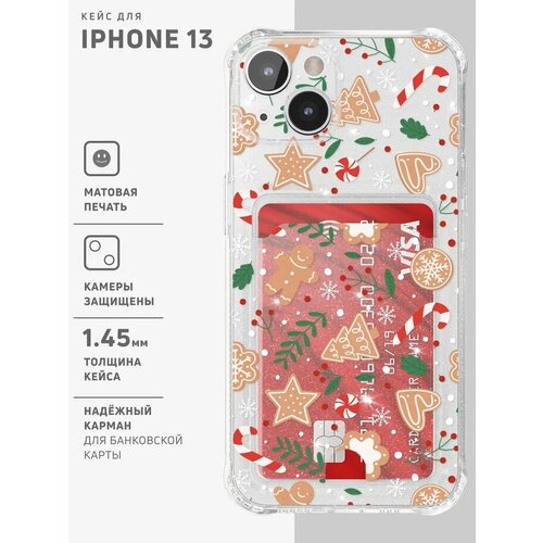 Чехол на Айфон 13 с картой, прозрачный с блестками / Накладка для iPhone 13 с принтом "Gingerbread pattern"
